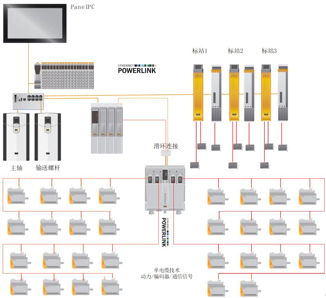從圖5整個機器的配置可以看到,多達36個伺服電機,其高速同步性,由POWERLINK實時網(wǎng)絡來保障,達到百微秒級的任務周期。而另一方面采用ACOPOSmotor伺服驅(qū)動與電機一體的設計,也讓整個接線變得更少,且空間緊湊,易于機械的安裝維護。