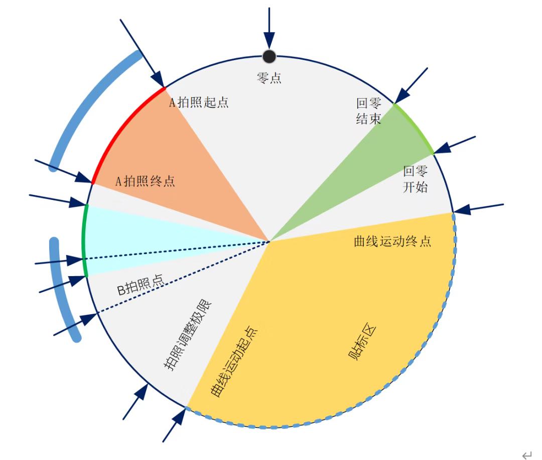 在貼標的托盤上,瓶子會被卡到托盤的凹槽中,如果瓶子是非圓形的,那么這個托盤必須旋轉(zhuǎn)到所需貼標面(如有些瓶子是菱形或者橢圓形),因此,需要獲得一個旋轉(zhuǎn)角度使得其剛好可以作為貼標的起點,而另一方面,這個托盤在進入貼標區(qū)域的時候,它必須與貼標頭保持線速度的一致,然后再去回零,整個過程根據(jù)貼標尺寸的變化,是一個電子凸輪曲線(CAM)位置環(huán)控制,這個就需要托盤高速跟隨主軸,并且隨著貼標尺寸規(guī)格的變化可以自動計算凸輪曲線,并獲得光滑的切換能力。圖3-則顯示了每個托盤都需要進行的這個運動控制過程。
